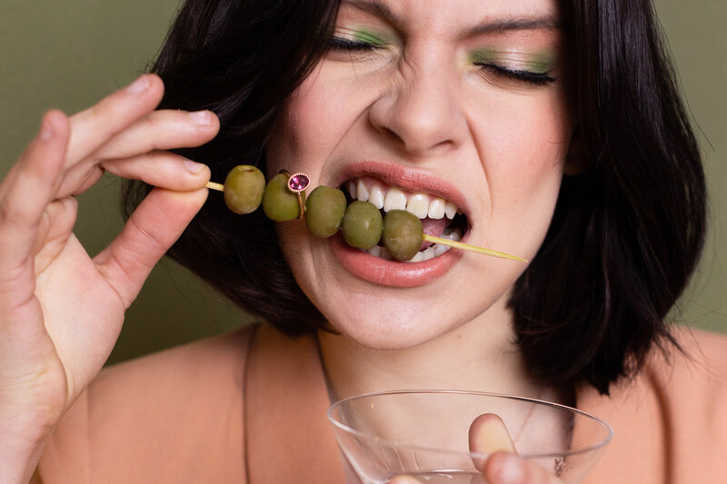 Picture this: a pink tourmaline ring speared between two olives, dangling from a cocktail pick, submerged in a martini about to be bitten into by a model in a salmon pink suit.